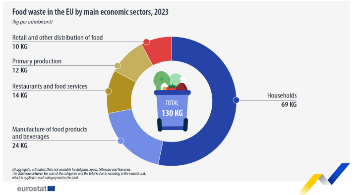 In 2023, around 130 kilograms (kg) of food per person were wasted in the EU. In total, the EU generated 58.2 million tonnes of food waste, which includes edible and inedible parts, indicating a slight increase of 0.7% compared with 2022 (57.8 million tonnes).