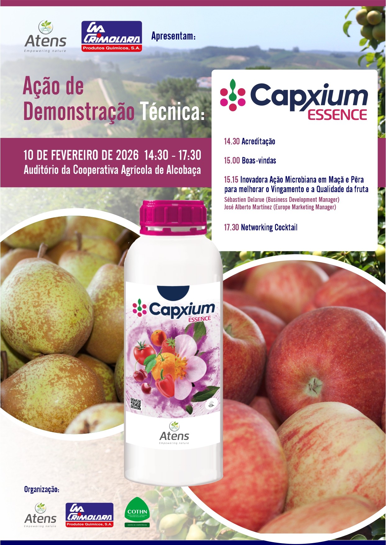 O Auditório da Cooperativa Agrícola de Alcobaça vai receber no próximo dia 10 de fevereiro de 2026, mais uma ação de demonstração técnica do produto Capxium Essence, desta feita, dedicada à cultura das pomóideas. Mais uma iniciativa da Atens e Crimolara com o apoio do COTHN-CC.