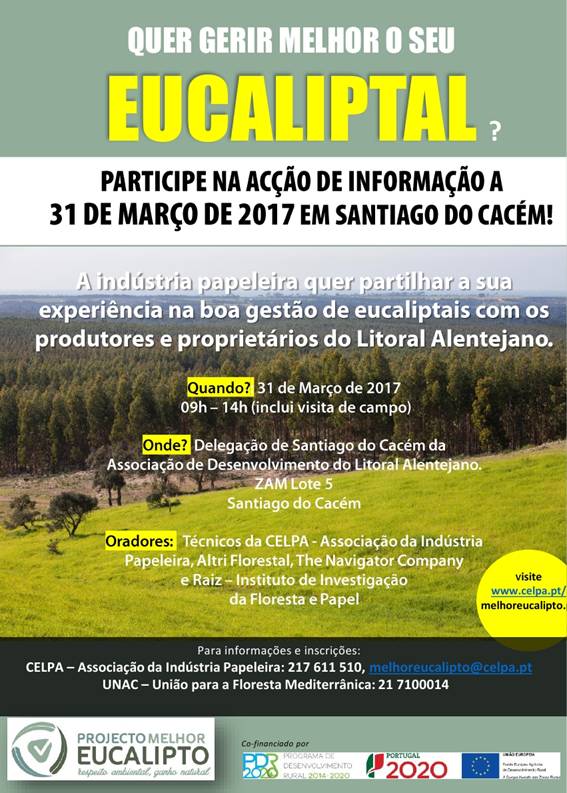 A primeira ação de informação do Projeto Melhor Eucalipto de 2017 vai acontecer a 31 de Março em Santiago do Cacém e terá como parceiro a UNAC – União da Floresta Mediterrânica.