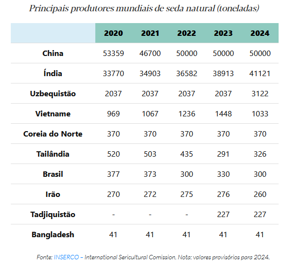 A China mantém-se na liderança mundial, com uma produção da ordem das 50 mil toneladas, e emprega nesta atividade cerca de um milhão de pessoas. Seguem-se a Índia e o Uzbequistão. A maioria da produção mantém-se na Ásia, embora haja alguns novos produtores relevantes, como o Brasil. No total, produz-se seda natural em cerca de 60 países do mundo, mas nem toda conta com amoreiras na sua cadeia de valor. A maioria da produção segue para os EUA, Itália, Japão, França e China – os cinco principais consumidores.