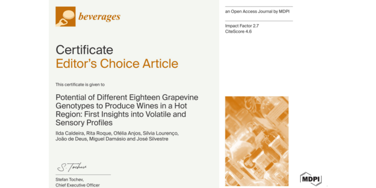 O artigo científico “Potential of Different Eighteen Grapevine Genotypes to Produce Wines in a Hot Region: First Insights into Volatile and Sensory Profiles” foi distinguido como Editor’s Choice Article pela revista Beverages, um reconhecimento que destaca a relevância e a qualidade do trabalho desenvolvido.