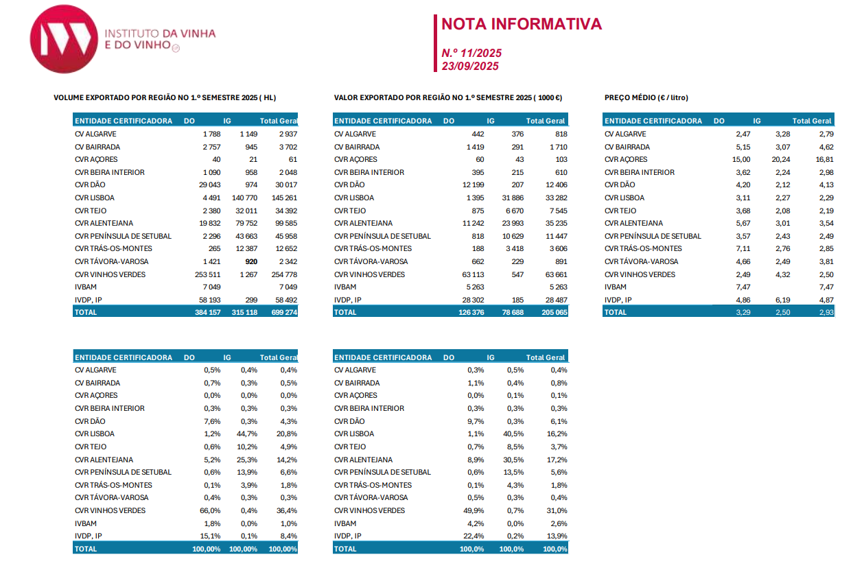 De seguida apresentamos a síntese dos dados decorrentes das declarações feitas pelos agentes económicos, junto do INE, no primeiro semestre de 2025, relativos às exportações de vinho nacional certificado, por entidade certificadora (inclui os vinhos certificados declarados com NC a 8 dígitos e NC a 10 dígitos).
