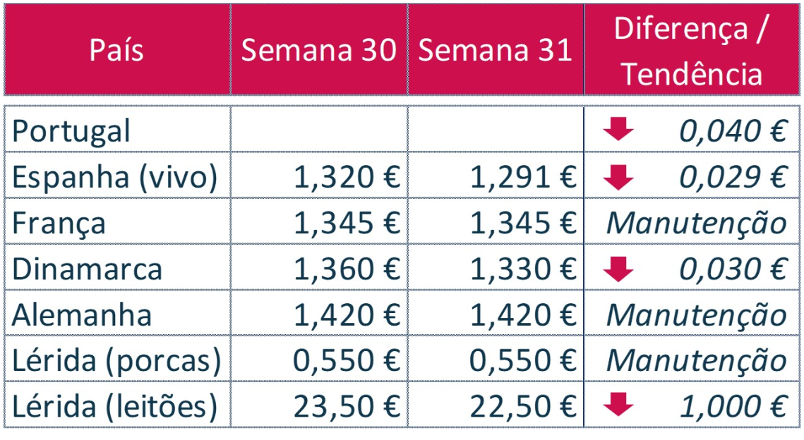 Analisando estes valores, segundo equivalências teóricas, teremos em euros/kg peso vivo para a semana 31/2021 (02/08 a 06/08): Espanha 1,29; França 1,20; Alemanha 1,10; Holanda 1,07; Bélgica 1,11; Dinamarca 1,19.