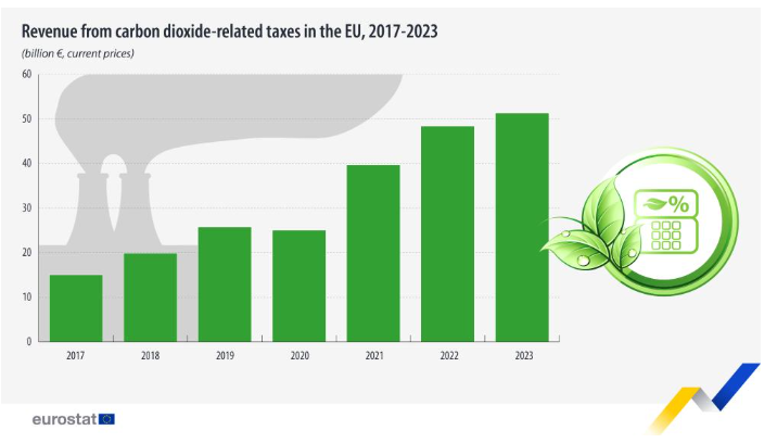 Between 2017 and 2023, the revenue from carbon dioxide related taxes in the EU increased strongly, growing from €15 billion to €51 billion. Carbon (dioxide) taxes are levied on the carbon content of fossil fuels. Their share in the overall energy taxes increased from 6.0% in 2017 to 19.7% in 2023.