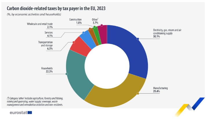 In 2023, more than three-quarters (76.4%) of the carbon taxes were collected from businesses, while households contributed 22.3% and non-residents 1.3%. The energy sector (supply of electricity, gas, steam and air conditioning) contributed 30.1% of total carbon taxes, followed closely by manufacturing, which accounted for 29.4%.