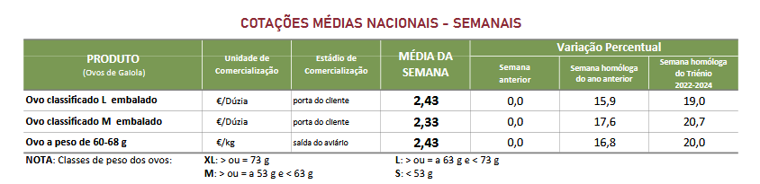 As cotações médias nacionais dos ovos classificados e embalados das classes de peso L e M, dos ovos de gaiola na produção (ovo a peso de 60 a 68 g) e dos ovos de solo e de ar livre não sofreram alterações.