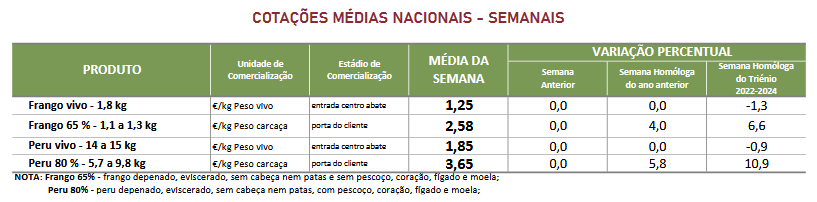 Manutenção da estabilidade das cotações médias nacionais de carne de aves, quer de frango e peru, vivo ou abatido.
