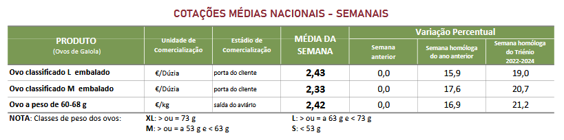 As cotações médias nacionais dos ovos de gaiola na produção (ovo a peso de 60 a 68 g) e classificados e embalados das classes de peso L e M não sofreram alterações. Aumento das cotações médias nacionais dos ovos classificados de solo (0,03 €/dúzia) e de ar livre (0,02 €/dúzia).