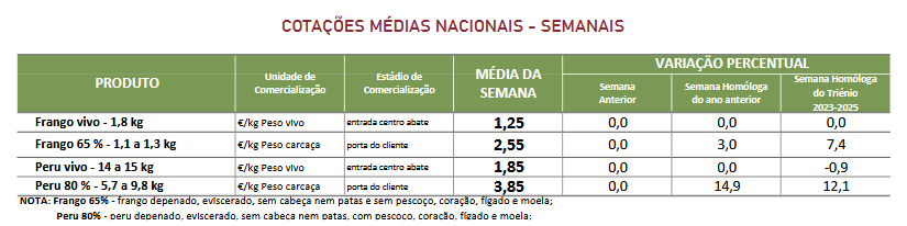 Estabilidade das cotações médias nacionais do frango vivo (1,8 kg), do frango abatido (65% – 1,1 a 1,3 kg), do peru vivo (14 a 15 kg) e do peru abatido (80% – 5,7 a 9,8 kg).