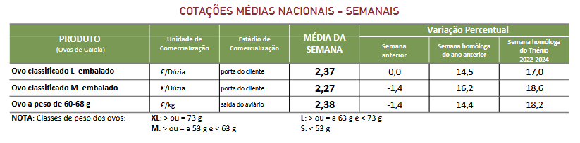 Estabilidade das cotações médias nacionais dos ovos classificados e embalados das classes de peso L. Descidas das cotações médias dos ovos de gaiola na produção (ovo a peso de 60 a 68 g), dos ovos classificados e embalados das classes de peso M, dos ovos de solo e dos ovos de ar livre em 0,03 €/kg, 0,04 €/dúzia, 0,03 €/dúzia e 0,05 €/dúzia, respetivamente.