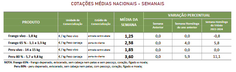Na semana em análise as cotações médias nacionais do frango vivo (de 1,8 kg), do frango abatido (65% – de 1100 a 1300 g), do peru vivo (de 14 a 15 kg) e do peru abatido (80% – de 5,7 a 9,8 kg) mantiveram-se estáveis em relação à semana anterior. Estabilidade das cotações médias nacionais da perna e do peito de frango e de peru.
