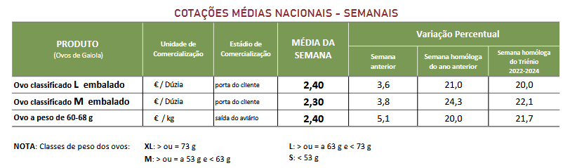 Na semana em análise registou-se uma subida das cotações médias nacionais dos ovos de gaiola classificados e embalados (ovotermo) das classes de peso L e M (+8 cêntimos / dúzia) e dos ovos de gaiola na produção (ovo a peso de 60 a 68 g) (+12 cêntimos / kg), em relação à semana anterior. Aumento das cotações médias nacionais dos ovos classificados de solo (+6 cêntimos / dúzia) e de ar livre (+10 cêntimos / dúzia).