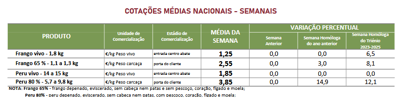 Estabilidade das cotações médias nacionais do frango vivo (1,8 kg), do frango abatido (65% – 1,1 a 1,3 kg), do peru vivo (14 a 15 kg) e do peru abatido (80% – 5,7 a 9,8 kg).