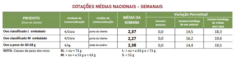 Estabilidade das cotações médias nacionais dos ovos classificados e embalados das classes de peso L e M, dos ovos de gaiola na produção (ovo a peso de 60 a 68 g), dos ovos de ar livre e dos ovos de solo.