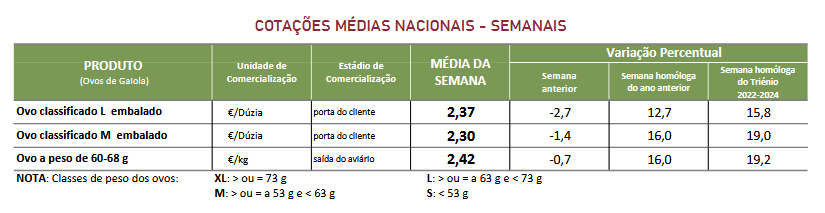 Estabilidade completa cotações médias nacionais dos ovos classificados e embalados das classes de peso L e M, dos ovos de gaiola na produção (ovo a peso de 60 a 68 g) e dos ovos de solo e de ar livre.