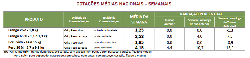 Estabilidade das cotações médias nacionais do frango vivo (1,8 kg), do frango abatido (65% – 1,1 a 1,3 kg) e do peru vivo (14 a 15 kg). Renova-se o aumento da cotação média nacional do peru abatido (80% – 5,7 a 9,8 kg), esta semana de 0,18€/kg, devido a um aumento da procura, próprio da época.