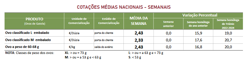 As cotações médias nacionais dos ovos classificados e embalados das classes de peso L e M, dos ovos de gaiola na produção (ovo a peso de 60 a 68 g) e dos ovos de solo e de ar livre não sofreram alterações.