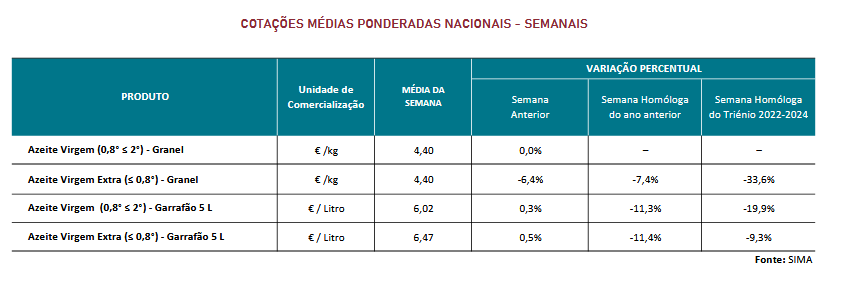 Teve início a campanha de comercialização de azeite 2025/2026 na área de mercado Beira Interior, mantendo-se em curso nas áreas de comercialização Alentejo e Ribatejo. Na Beira Interior, o elevado volume de existências provenientes da campanha anterior está a condicionar o escoamento do produto. Adicionalmente, verifica-se uma redução da produção nesta campanha, associada aos incêndios ocorridos durante o verão. Em relação à qualidade, o azeite caracteriza-se como bom, em todas as regiões. De acordo com as previsões do INE, perspetiva-se uma quebra na produtividade em cerca de 20%, em relação à campanha anterior, decorrente das condições meteorológicas adversas ocorridas durante a fase de floração bem como da destruição de áreas significativas de olival tradicional pelos incêndios que lavraram na região transmontana.