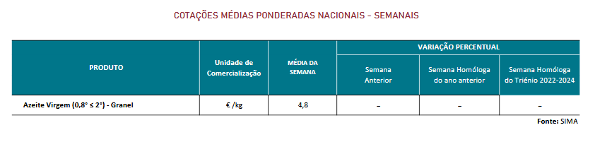 Início da campanha de comercialização de azeite 2025/2026 na área de mercado Alentejo Norte, caracterizado como bom em relação à sua qualidade. De acordo com as previsões do INE, perspetiva-se uma quebra na produtividade em cerca de 20%, em relação à campanha anterior, devido às condições meteorológicas adversas ocorridas durante a floração e ainda, devido à destruição de áreas significativas de olival tradicional pelos incêndios que lavraram na região transmontana.