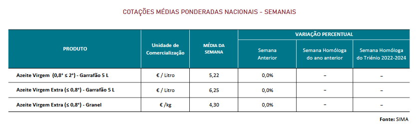 Continuação da campanha de comercialização de azeite 2024/25 nas áreas de mercado Ribatejo e Trás-os-Montes, com manutenção das cotações médias ponderadas. Na área de mercado de Trás-os-Montes, as quantidades de azeite transacionadas foram inferiores e continua a existir concorrência de azeite a granel importado de Espanha.
