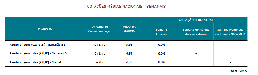 Continuou a campanha de comercialização de azeite 2024/25 nas áreas de mercado do Alentejo, Ribatejo e Trás-os-Montes, com manutenção das cotações. Na área de mercado de Trás-os-Montes, as quantidades de azeite comercializadas foram inferiores e continua a existir concorrência de azeite a granel importado de Espanha. Nesta campanha, o azeite caracteriza-se como médio a bom em relação à sua qualidade. De acordo com as últimas estimativas do INE, perspetiva-se um aumento na produção de azeite em 10%, em relação à campanha anterior, atingindo cerca de 177 000 toneladas.
