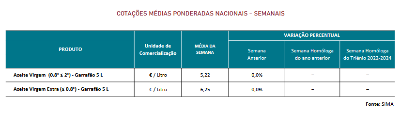 Fim da campanha de comercialização de azeite na área de mercado Trás-os-Montes e continuação no Ribatejo, com manutenção das cotações médias ponderadas. Na área de mercado de Trás-os-Montes, as quantidades de azeite transacionadas foram inferiores e continuou a existir concorrência de azeite a granel importado de Espanha.