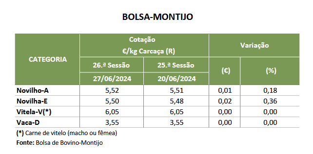Na Região: as cotações máximas, de novilha e de novilho, 12 a 24 meses, cruzados charolês, diminuíram 0,05 € kg C; as cotações, máxima e mais frequente, de vitelo macho, 6 a 8 meses, cruzado Charolês, aumentaram, 0,04 €/kg V e 0,03 €/kg V, respetivamente, mas, a cotação mínima diminuiu 0,10 €/kg V; as cotações, máxima e mais frequente, de vitelo macho, 8 a 12 meses, cruzado Charolês, diminuíram, 354,00 €/U e 31,00 €/U, respetivamente.