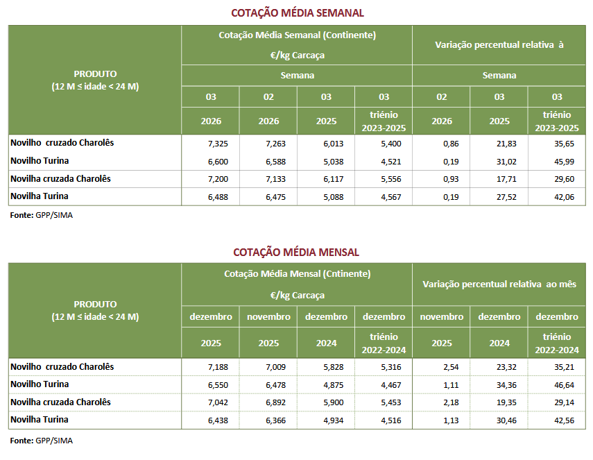 cotações médias, de novilho e de novilha, 12 a 24 meses, Turina, aumentaram, 0,012 €/kg C e 0,013 €/kg C, respetivamente.