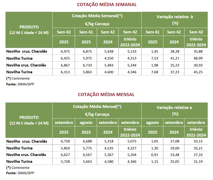 As cotações médias, de novilha e de novilho, 12 a 24 meses, cruzados Charolês, aumentaram, 0,133 €/kg C e 0,100 €/kg C, respetivamente. As cotações médias, de novilha e de novilho, 12 a 24 meses, Turina, aumentaram, 0,450 €/kg C.