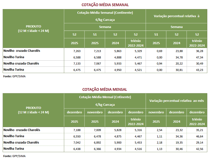 As cotações médias, de novilho e de novilha, 12 a 24 meses, cruzados Charolês, aumentaram, 0,050 €/kg C e 0,067 €/kg C, respetivamente. As cotações médias, de novilho e de novilha, 12 a 24 meses, Turina não se alteraram