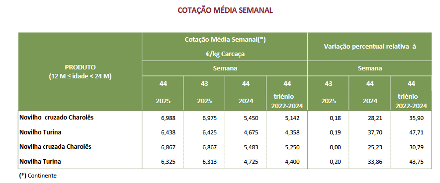 No Continente as cotações médias mais frequentes, de novilho e de novilha, 12 a 24 meses, cruzados Charolês, e a cotação média mais frequente de novilha, 12 a 24 meses, Turina, aumentaram 0,013 €/kg C.