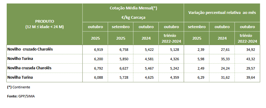 Na região Beira Interior as cotações mais frequentes de novilho, 12 a 24 meses, cruzado Charolês e de novilha e de novilho, 12 a 24 meses, Turina aumentaram 0,05 €/kg C.