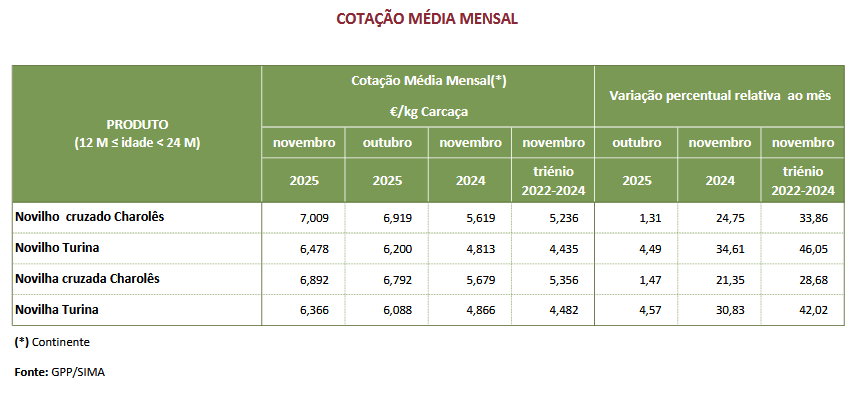 As cotações médias, de novilho e de novilha, 12 a 24 meses, cruzados Charolês, aumentaram, 0,075 €/kg C e 0,100 €/kg C, respetivamente. As cotações médias, de novilho e de novilha, 12 a 24 meses, Turina não se alteraram.