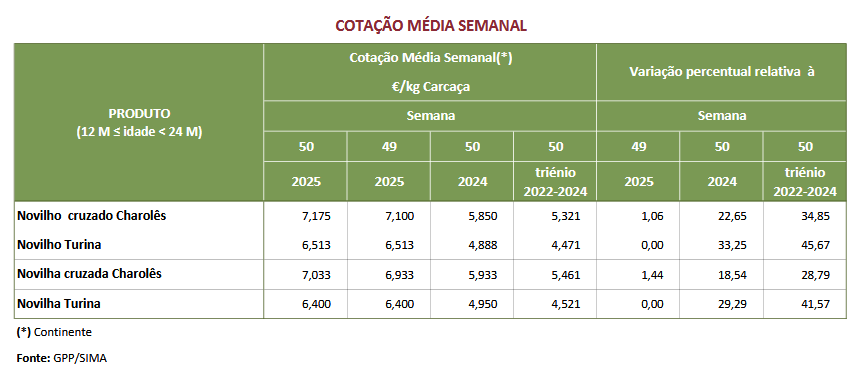 As cotações médias, de novilho e de novilha, 12 a 24 meses, cruzados Charolês, aumentaram, 0,075 €/kg C e 0,100 €/kg C, respetivamente. As cotações médias, de novilho e de novilha, 12 a 24 meses, Turina não se alteraram.