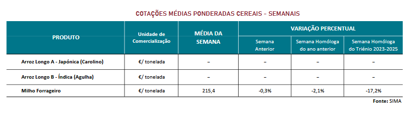 Terminaram as campanhas de comercialização de arroz Carolino e Agulha na área de mercado Vale do Sado e Mira. A qualidade do arroz caracterizou-se como boa, exceto no Ribatejo onde se classificou como média. Segundo o INE, prevê-se uma diminuição da produção em cerca de 5%, em relação à campanha anterior. Estima-se ainda que, 82,5% do arroz semeado em Portugal em 2025 foi do tipo Longo A (Carolino) e 17,5% do tipo Longo B (Agulha). Continuou a campanha de comercialização de milho forrageiro nas áreas de mercado do Alentejo e Beira Litoral, onde se perspetiva que a produção regional seja ligeiramente superior ao ano anterior. A qualidade do milho é classificada como boa no Alentejo e como média na Beira Litoral. De acordo com as estimativas do INE, a produção nacional do milho deverá registar um decréscimo de cerca de 15% face à campanha anterior, a mais baixa das últimas duas décadas, reflexo das sementeiras tardias e dos prejuízos causados por javalis e infestantes, num contexto em que os preços não acompanham o aumento dos custos de produção.