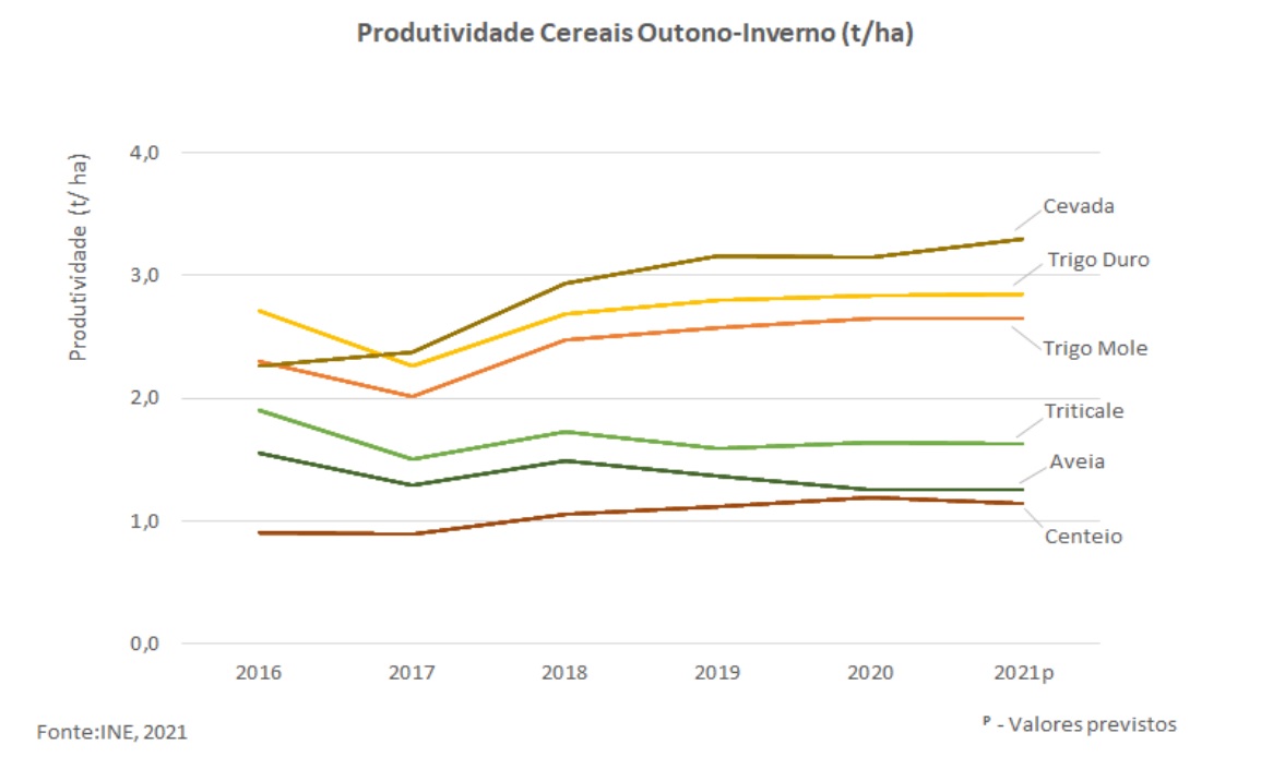 Nos cereais de outono-inverno, a acentuada redução dos teores de humidade do solo na fase de enchimento do grão não permitiu alcançar as produtividades inicialmente previstas pelo INE, principalmente nas searas instaladas mais cedo. As primeiras colheitas apontam para a manutenção do rendimento unitário no trigo, triticale e aveia.