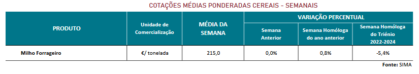 Continuação da campanha de comercialização de milho forrageiro na área de mercado Alentejo, com manutenção das cotações. A oferta apresentou-se média, para uma procura igualmente média. De acordo com as estimativas do INE, a produtividade do milho de regadio deverá registar um decréscimo de cerca de 5% face à campanha anterior, reflexo das sementeiras tardias e dos prejuízos causados por javalis e infestantes, num contexto em que os preços não acompanham o aumento dos custos de produção, condicionando a rentabilidade da cultura.