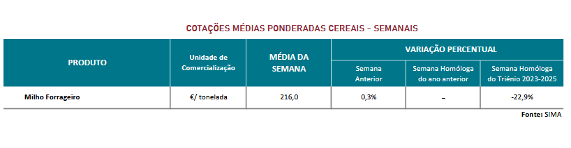 Continua a campanha de comercialização de milho na área de mercado no Alentejo, na qual a qualidade do milho é classificada como boa. De acordo com as estimativas do INE, a produção nacional de milho deverá registar um decréscimo de cerca de 15% face à campanha anterior, a mais baixa das últimas duas décadas, reflexo das sementeiras tardias e dos prejuízos causados por javalis e infestantes, num contexto em que os preços não acompanham o aumento dos custos de produção.