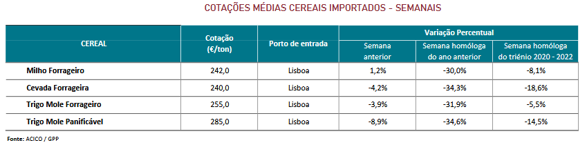Em relação à semana anterior, destaca-se a queda de 8,9% da cotação de trigo mole panificável. As cotações dos cereais importados têm vindo a diminuir desde o 2º semestre de 2022 (após o acordo de exportação de cereais através do Mar Negro ter sido estabelecido entre as partes e pela criação de corredores solidários por parte da UE) e neste momento, encontram-se inferiores às cotações homólogas do ano passado e da média do triénio 2022 – 2022.
