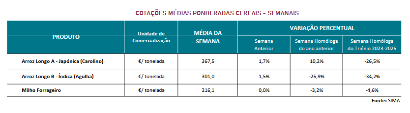 Terminou a campanha de comercialização de arroz Carolino na área de mercado Vale do Mondego e prosseguiu nas restantes regiões produtoras, assim como a campanha de arroz Agulha. Na região do Alentejo, registaram-se ajustamentos nas cotações. A qualidade do arroz caracteriza-se como boa, exceto no Ribatejo onde se classifica como média. Segundo o INE, prevê-se uma diminuição da produção em cerca de 5%, em relação à campanha anterior. Estima-se ainda que, 82,5% do arroz semeado em Portugal em 2025 foi do tipo Longo A (Carolino) e 17,5% do tipo Longo B (Agulha). Continuou igualmente, a campanha de comercialização de milho forrageiro nas áreas de mercado do Alentejo e Beira Litoral, onde se perspetiva que a produção regional seja ligeiramente superior ao ano anterior. A qualidade do milho é classificada como boa no Alentejo e como média na Beira Litoral. De acordo com as estimativas do INE, a produção nacional do milho deverá registar um decréscimo de cerca de 15% face à campanha anterior, reflexo das sementeiras tardias e dos prejuízos causados por javalis e infestantes, num contexto em que os preços não acompanham o aumento dos custos de produção.