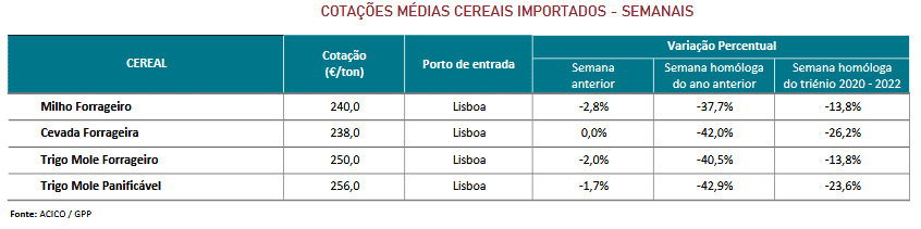 cotação. As cotações dos cereais importados têm vindo a diminuir desde o 2º semestre de 2022 (após o acordo de exportação de cereais através do Mar Negro ter sido estabelecido entre as partes e pela criação de corredores solidários por parte da UE) e neste momento, encontram-se inferiores às cotações
