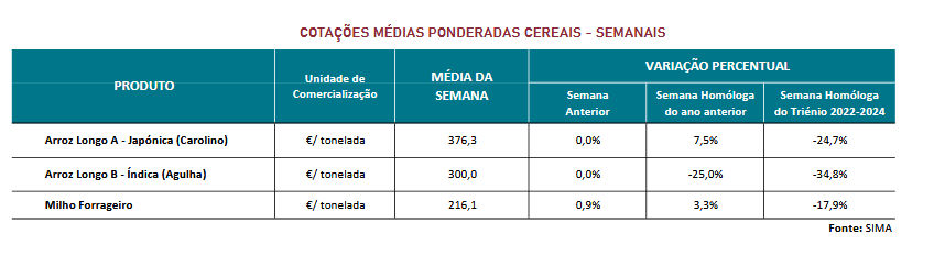 Prosseguiu a campanha de comercialização de arroz Agulha na área de mercado Vale do Sado e Mira e de arroz Carolino nas áreas de mercado Vale do Sado e Mira e Vale do Mondego. Na Beira Litoral, o escoamento realiza-se com alguns constrangimentos devido à existência de stocks do ano anterior e a oferta e a procura diminuíram. A qualidade do arroz caracteriza-se como boa em ambas as regiões e as estimativas do INE preveem uma diminuição da produção em cerca de 5%, em relação à campanha anterior. Estima-se que 82,5% do arroz semeado em Portugal em 2025 foi do tipo Longo A (Carolino) e 17,5% do tipo Longo B (Agulha).