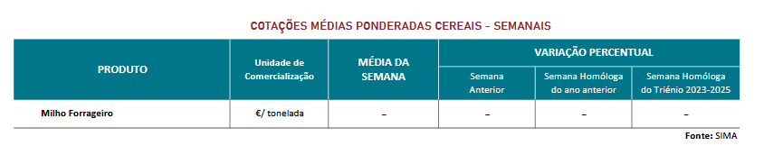 Terminou a campanha de comercialização de milho na área de mercado Alentejo, na qual a qualidade do milho é classificada como boa. De acordo com as estimativas do INE, a produção nacional do milho deverá registar um decréscimo de cerca de 15% face à campanha anterior, a mais baixa das últimas duas décadas, reflexo das sementeiras tardias e dos prejuízos causados por javalis e infestantes, num contexto em que os preços não acompanham o aumento dos custos de produção.
