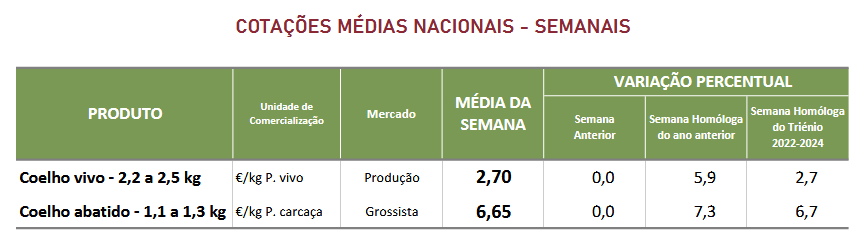 As cotações médias nacionais do coelho vivo (2,2 a 2,5 kg) e do coelho abatido (1,1 a 1,3 kg) mantiveram-se estáveis.