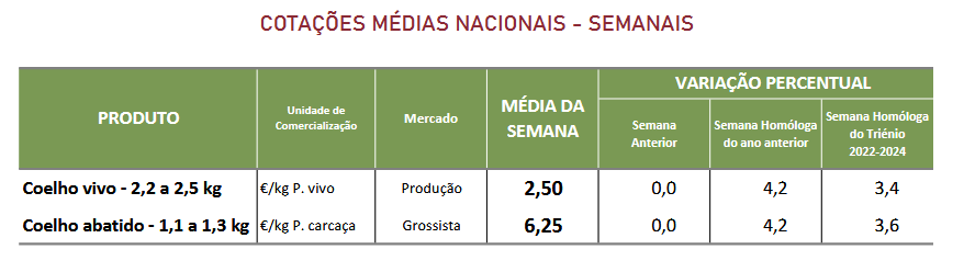 Estabilidade das cotações médias nacionais do coelho vivo (2,2 a 2,5 kg) e do coelho abatido (1,1 a 1,3 kg).