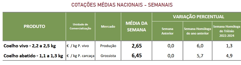 Na semana em análise as cotações médias nacionais do coelho vivo (de 2,2 a 2,5 kg) e do coelho abatido (de 1,1 a 1,3 kg) mantiveram-se estáveis em relação à semana anterior, pela 4ª semana consecutiva.
