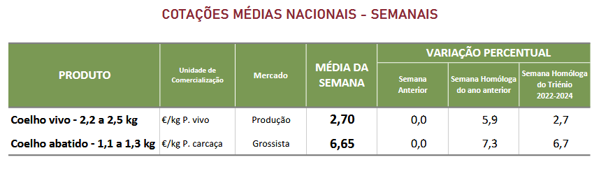 As cotações médias nacionais do coelho vivo (2,2 a 2,5 kg) e do coelho abatido (1,1 a 1,3 kg) mantiveram-se estáveis.