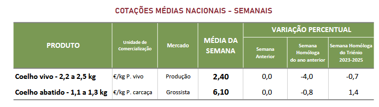 As cotações médias nacionais, mais frequentes, do coelho vivo (2,2 a 2,5 kg) e do coelho abatido (1,1 a 1,3 kg) mantiveram-se estáveis face à semana anterior.