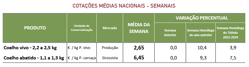 Na semana em análise as cotações médias nacionais do coelho vivo (de 2,2 a 2,5 kg) e do coelho abatido (de 1,1 a 1,3 kg) mantiveram-se estáveis em relação à semana anterior.