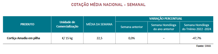 Continuou a campanha de comercialização da cortiça 2025 na área de mercado Trás-os-Montes, variedade Amadia do Mato, com manutenção das cotações médias. As quantidades transacionadas foram superiores em comparação com a semana anterior. Agentes económicos e produtores contactados revelaram não mostrar interesse em transacionar a cortiça, por o preço ser demasiado baixo e os custos de extração serem bastante elevados. O mercado apresentou uma oferta média para uma procura média. Não se verifica concorrência de produto importado. A cortiça caracteriza-se como boa em relação à sua qualidade.